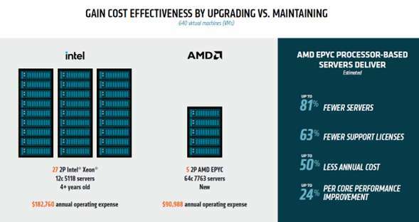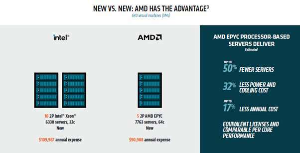 [i] MLNCDN-001: As of 7/20/22 based on AMD internal analysis using AMD EPYC™ SERVER VIRTUALIZATION TCO ESTIMATION TOOL – v10.30 estimating the cost and quantity of 2P AMD EPYC 7713 powered servers with a SPECrate®2017_int_base score of 778, https://www.spec.org/cpu2017/results/res2021q3/cpu2017-20210720-28438.html compared to a 2P Intel Xeon Gold 5118 based servers with a SPECrate®2017_int_base score of 133, https://www.spec.org/cpu2017/results/res2019q3/cpu2017-20190805-16469.html to compare annual costs of existing fully depreciated 4+ year-old Xeon CPU-based infrastucture to acquiring new EPYC CPU-based infrastructure. For details, see https://www.amd.com/en/claims/epyc3x#faq-MLNCDN-001