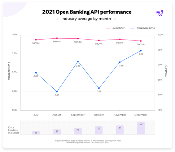From July to December the number of live Data Holders included in Frollo’s Open Banking API analysis increased from 11 to 40[2]. Despite this growth, the average industry performance remained stable. API response times averaged below one second and reliability never dropped below 98%.