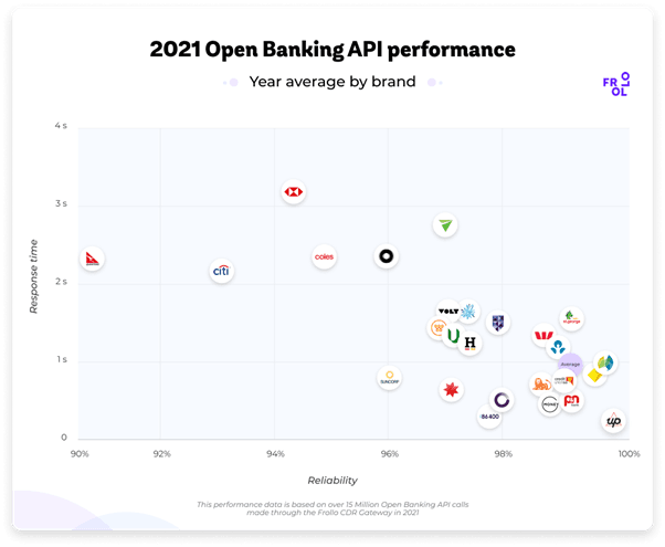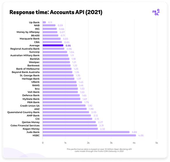 January 2022 – Frollo, Australia’s leading Open Banking intermediary[1], has published its 2021 Open Banking API performance monitor. Based on over 15 Million API calls on its Open Banking platform in 2021, the report compares speed and – for the first time ever – reliability between banks. With only a few exceptions, most banks were found to be delivering a fast and reliable customer experience.