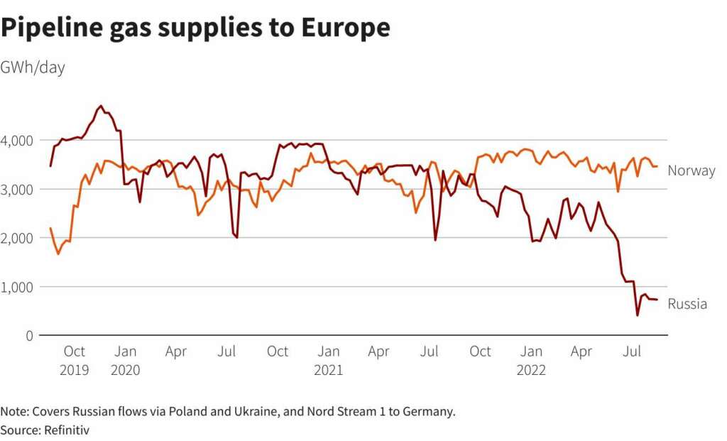 Norway is now Europe’s biggest supplier of gas, according to Refinitiv Eikon data, overtaking Russia, which has cut back on its gas deliveries.