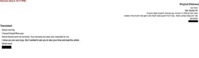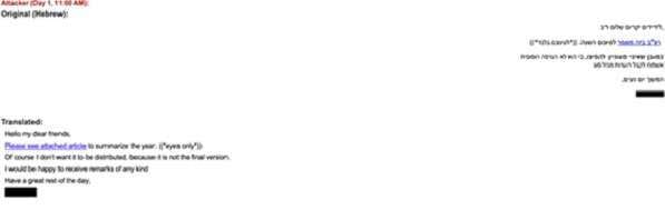 Livni was approached via email by someone impersonating a well known former Major General in the IDF who served in a highly sensitive position. The email was sent from his genuine email address which had previous correspondence with her in the past. The email contained a link to a file which the attacker requested her to open and read. When she delayed doing so, the attacker approached her several times asking her to open the file using her email password. This prompted her suspicions. When she met the former Major General and asked him about the email, it was confirmed that he never sent such an email to her.