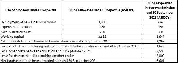 A summary of expenditure since listing, and a comparison with the use of funds statement in the Company’s prospectus dated 30 November 2020, is set out below: