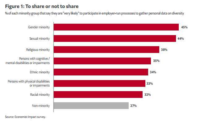 The research does not find that all employees of are equally comfortable with disclosure. Only a third of racial and ethnic minorities and employees with a cognitive/mental or physical disability say they are “very likely” to participate in efforts to collect data, for instance, compared to 44% of individuals identifying as LGBTQ+. People who identify as a member of no minority group are notably the least likely of any group to express their willingness to share data.