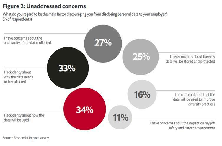 The research offers a range of suggestions to build the trust necessary to gather more employee data. Most concerns can be allayed with clearer communication with employees about the purpose of collecting DEI data, public commitments to improvements to diversity and inclusion, and taking care in the methods, timing and means of gathering this data.