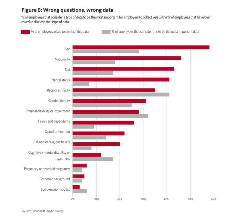 The survey also reveals a disconnect between the types of data employees think should be collected and the data employers are collecting. The most commonly requested data by employers is age, nationality and sex, but employees consider data on race and ethnicity and physical disability or impairment to be most important for the development and implementation of effective DEI strategy.
