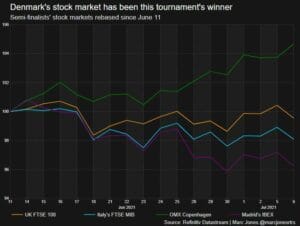 So what about this year? Well if it’s any consolation for Denmark after Wednesday’s semi-final defeat to a soft penalty, Copenhagen’s bourse has outscored London’s FTSE 100 by nearly 5% since the start of the tournament and beaten Italy and the other losing semi-finalist Spain’s market by 6% and 8% respectively.